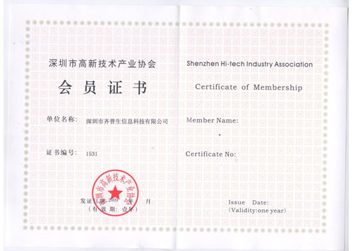 深圳市高新技術產(chǎn)業(yè)協(xié)會會員證書